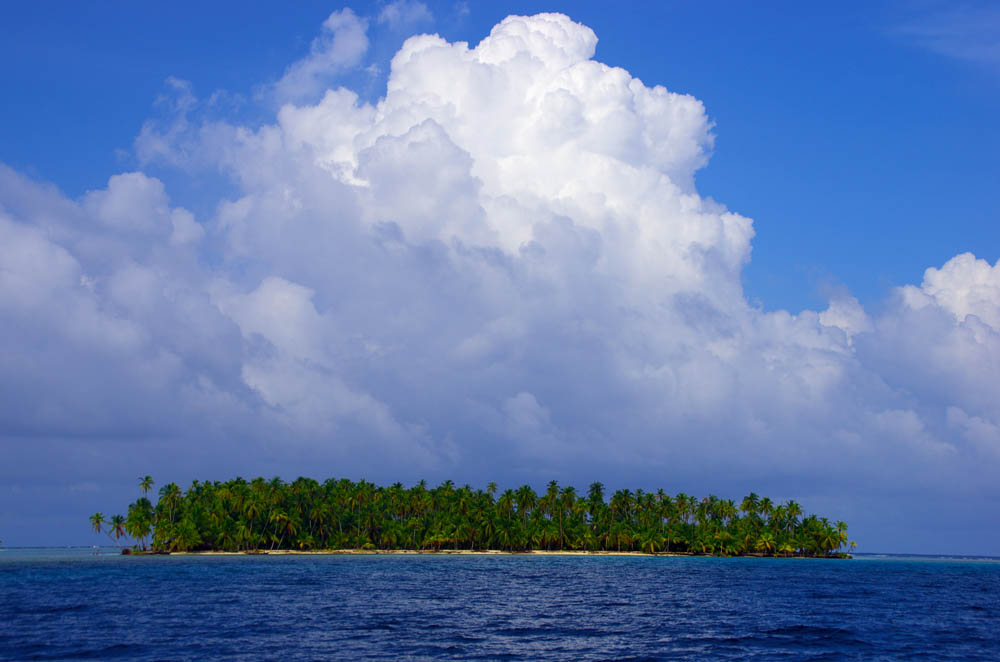 L’archipel des San Blas dans toute sa splendeur : de petites îles de cocotiers de quelques centaines de mètres de diamètre. Mettre le bateau au mouillage dans cet endroit est parfois périlleux à cause des des récifs de coraux. Quelques épaves de voiliers rappellent les risques omniprésents