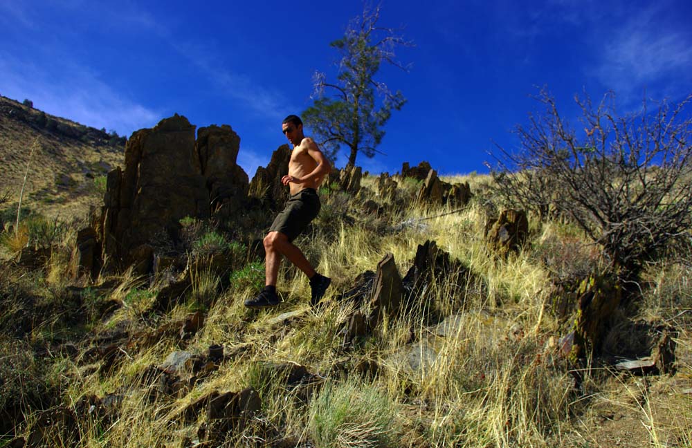 Nous ne savons pas vraiment pour quelle raison nous aimons finir nos petites excursions dans la nature au pas de course mais Etienne se prend bien au jeu et dévale le flanc des montagnes de Lake Isabella.